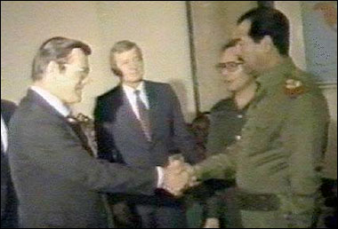 A Video capture of Donald Rumsfeld shaking hands with Saddam Hussein.