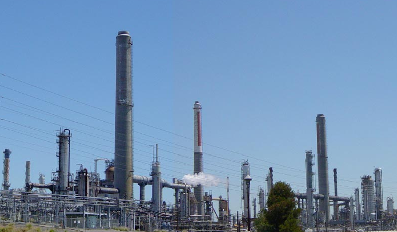 An oil refinery, Shell at Martinez, California. The tapering vertical elements are smokestacks to create draft for heating units. Most of the complex vertical units are fractionating towers. Others are flares.