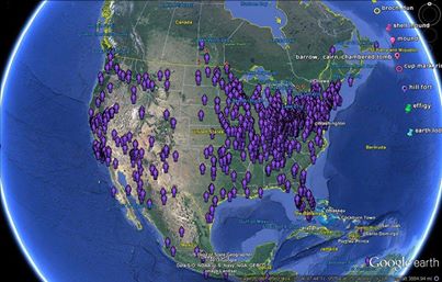The map below is a Google earth map created by researcher Cecelia Hall who has mapped all the giant skeleton reports of “Stone Builders, Mound Builders and the Giants of Ancient America”—a giant skeleton research organization. Worldwide there are over 1,400 and counting and over 1,000 in the U.S. alone. A staggering figure for sure!