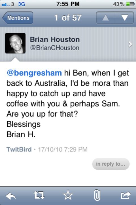 My involvement in freedom2b and the upcoming trip to Brisbane for the Asia-Pacific Suicide Prevention Conference in 2010 prompted me to do something about the alarming rates of suicide amongst LGBTI people and so one day I decided to send a tweet (twitter) to the Senior Pastor of my church, Brian Houston (Brian) not thinking much more of it. Surprisingly he chose to respond, asking me if I would like to do coffee. It seems simple but in reality this was a breakthrough and after so much written communication between Brian and me, here I was finally getting a chance to meet face-to-face.