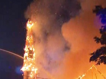 The church on Lafayette Street is a total loss. A witness says lightning struck the 180-foot steeple before it went up in flames.