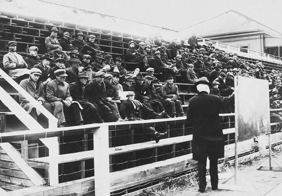 An open-air barber shop. Public events were encouraged to be held outdoors to hinder the spread of the disease during the influenza epidemic. Photographed at the University of California, Berkeley, in 1919. #National Archives