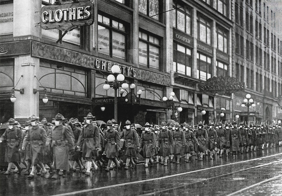 Left: A conductor checks to see if potential passengers are wearing required masks in Seattle, in 1918. Right: A mask is worn by a street sweeper in New York in 1918. The admonition of the New York Health Board to wear masks to check the spread of influenza epidemic was: “Better ridiculous than dead.” #