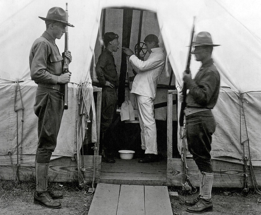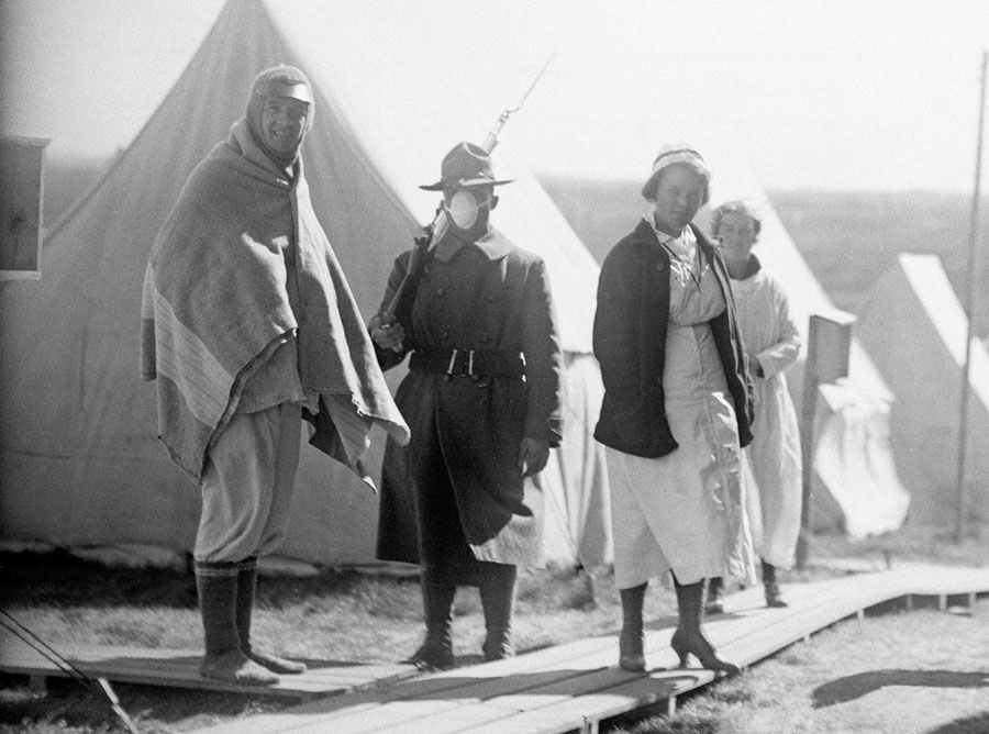 Original caption: “Photo shows a scene in the influenza camp at Lawrence, Maine, where patients are given fresh air treatment. This extreme measure was hit upon as the best way of curbing the epidemic. Patients are required to live in these camps until cured.” #Bettmann / Bettmann Archive