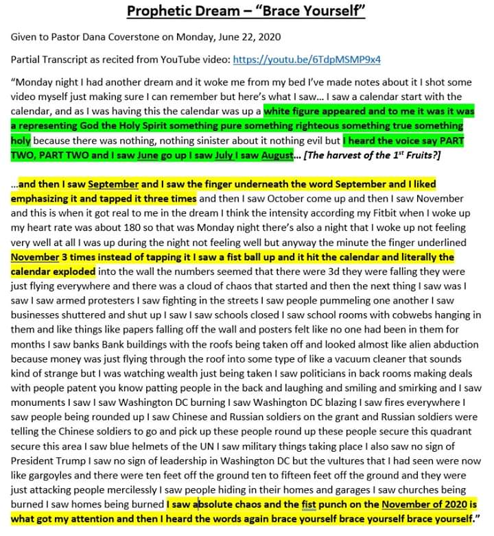 The things that I saw in a dream, vision back in December, are the same things that I watched in the news almost every day since March through June.