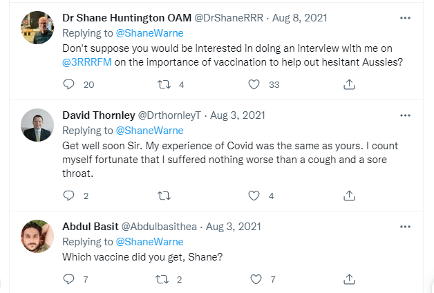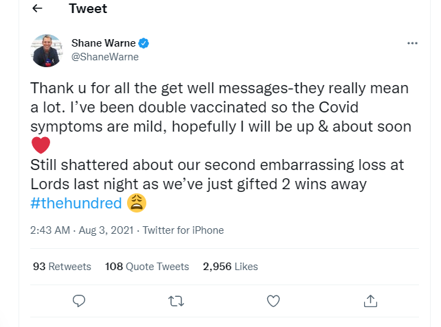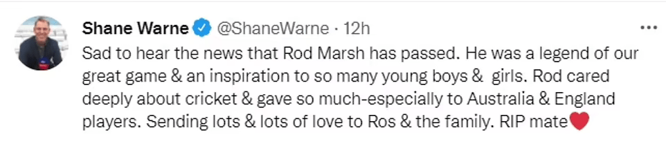 A tweet expressing his apppreciation for another Cricket legend Rod Marsh who died a day or two ago aged 74.