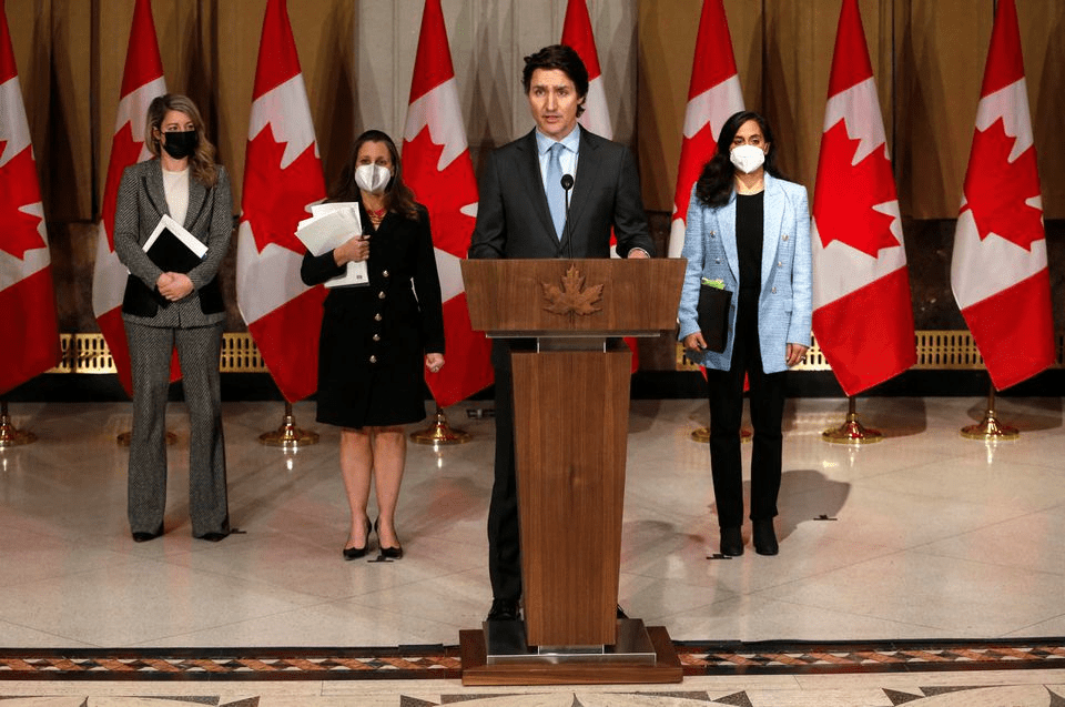 Canada’s Prime Minister Justin Trudeau speaks at a news conference about the situation in Ukraine with Canada’s Minister of Foreign Affairs Melanie Joly, Canada’s Deputy Prime Minister and Minister of Finance Chrystia Freeland, and Canada’s Defence Minister Anita Anand, in Ottawa, Ontario, Canada, February 22, 2022. REUTERS/Patrick Doyle