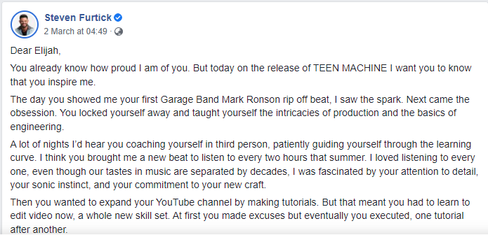 “You already know how proud I am of you. But today on the release of TEEN MACHINE I want you to know that you inspire me,” the North Carolina megachurch pastor wrote, explaining how hard his son had worked to create the music.
