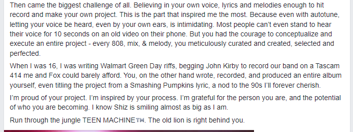 This is the part that inspired me the most,” Furtick wrote. “Because even with autotune, letting your voice be heard, even by your own ears, is intimidating. Most people can’t even stand to hear their voice for 10 seconds on an old video on their phone. But you had the courage to conceptualize and execute an entire project – every 808, mix, & melody, you meticulously curated and created, selected and perfected.”