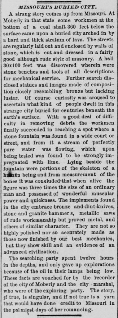 Chicago, April 11 – The press dispatch from St. Louis Wednesday last, purported to give an account of the discovery of a subterranean city in Moberly, Mo., created great excitement in historical circles of this city, and many inquiries were made as to its authenticity. A dispatch was sent to Mr. Kelly, editor of The Monitor at Moberly, as to the whether the alleged discovery was true or false. In reply Mr. Kelly wires the United Press as follows: