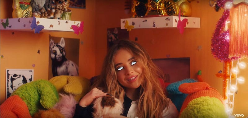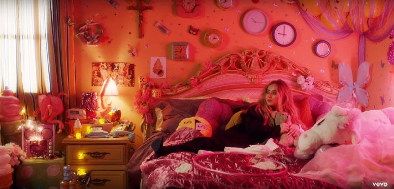 Sabrina’s room is filled with toys and teddy bears one could find in the bedroom of a young girl. Although Sabrina Carpenter is actually 20 years old, everything in the video is made to associate her with childhood – which appeals to her fanbase. However, on the right, there are two neon lights of naked women, the kind one might find at a sleazy strip club. The combination of the kiddie toys with the “adult” neons point to one disturbing concept: The sexualization of minors.