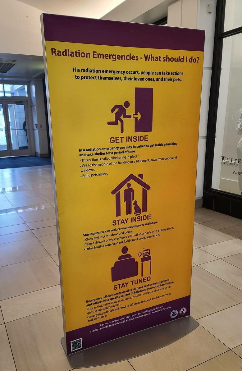 The signs then advise people “If you were outside when the blast hit, take off all clothes, shower and shampoo to wash the radiation off immediately.”
