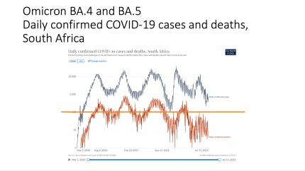 He went on to show global data showing omicron infections were rising but deaths were declining. But the greatest decline was in South Africa, a country with a low vaccination rate. “They were one of the first to get the BA.5 and now they’ve almost completely cleared it,” he said.