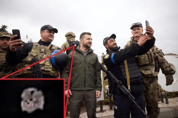 One photograph posted on Zelensky’s Telegram and Facebook accounts (archived here and here) captured the president as he posed for selfies with Ukrainian troops. As Zelensky flashed a smile for the camera of a cheerful service member, he was flanked by a heavily equipped soldier standing guard and facing the opposite direction. Just over Zelensky’s right shoulder, a small but significant patch could be seen on the back of the soldier’s flak vest.