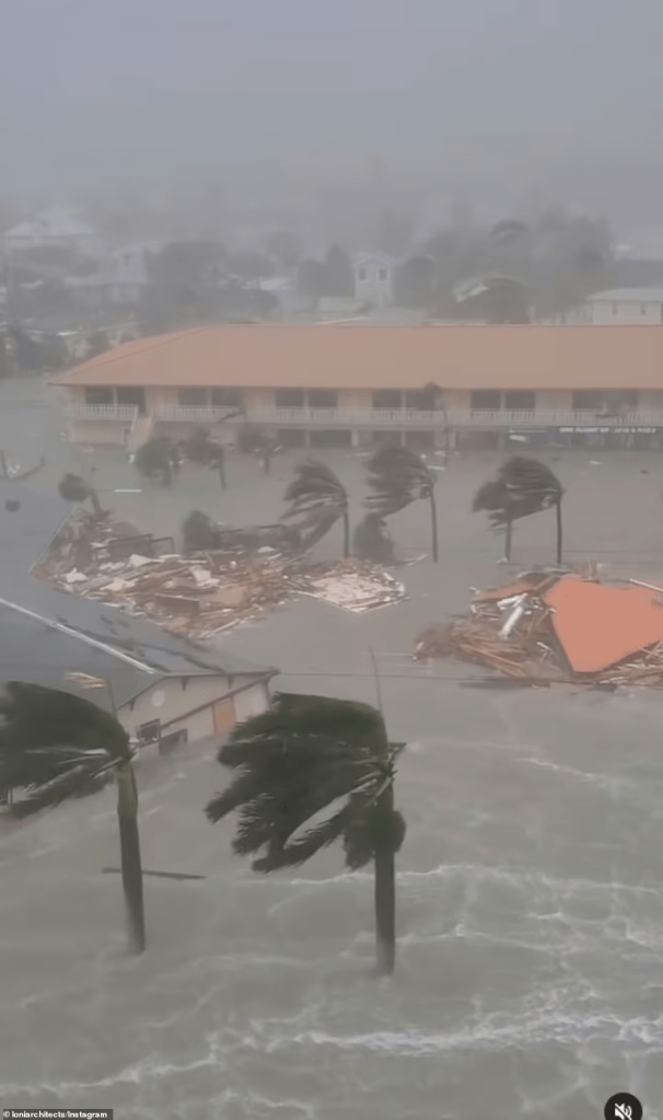 It sees the ‘unsurvivable’ torrent of water engulf palm trees in the tropical resort and rip some from their roots as it was forced forwards by 155mph winds – only the fifth storm in history to hit land at that speed.