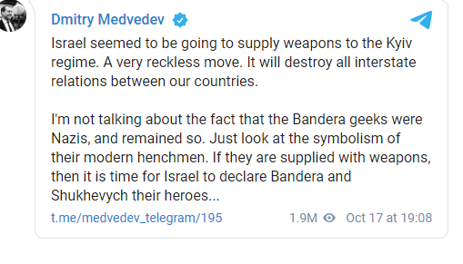 “Israel seems to be going to supply weapons to the Kyiv regime. A very reckless move.