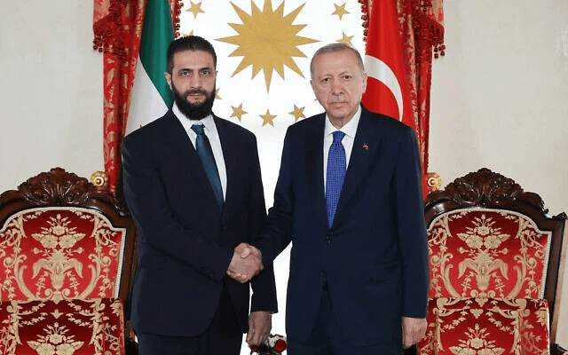 Turkish President Recep Tayyip Erdogan (R) and Syria’s interim leader Ahmed al-Sharaa (L) shake hands during their meeting in Istanbul, Turkey, May 24, 2025. (HANDOUT / TURKISH PRESIDENTIAL PRESS SERVICE / AFP)