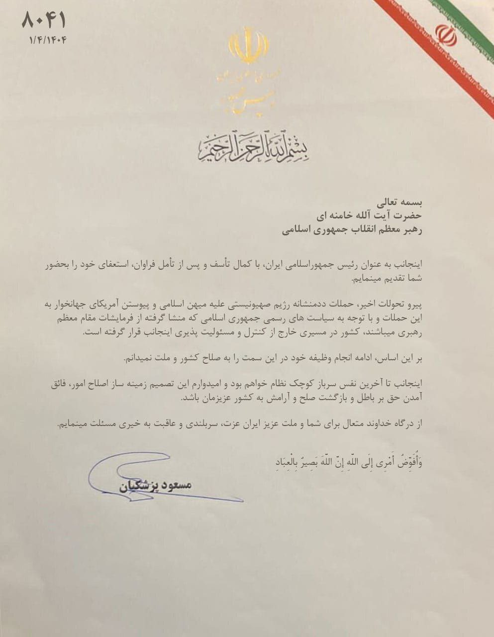 In light of the recent developments and the barbaric attacks of the Zionist regime against our Islamic homeland, as well as the joining of the world-devouring America to these attacks, and considering the official policies of the Islamic Republic which stem from the statements of the esteemed Leader, the country has entered a path beyond my control and responsibility.